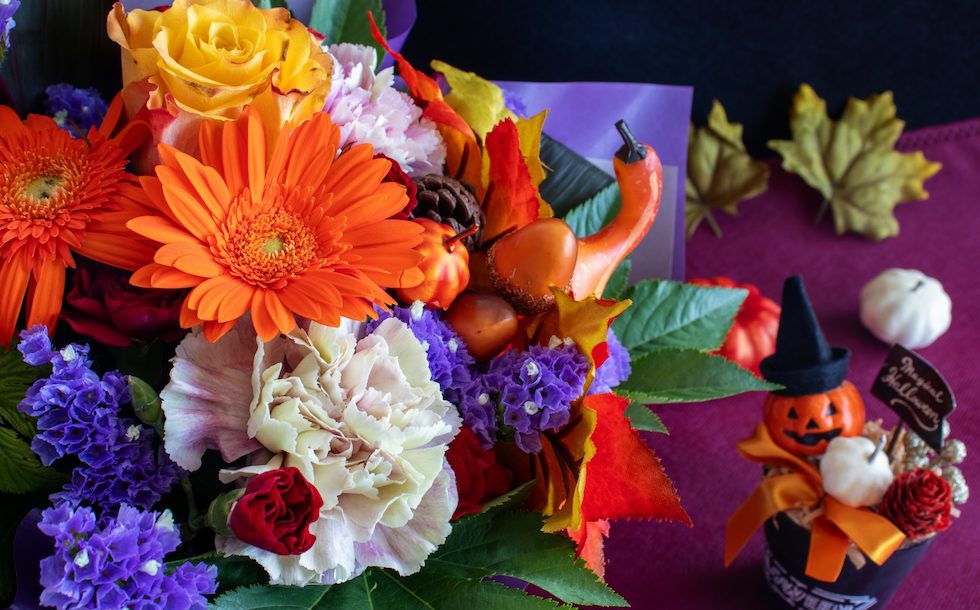 ハロウィーンパーティに飾るお花のアレンジメントです。オレンジ、パープルを基調にポップで楽しい雰囲気の感じられるアレンジメ […]